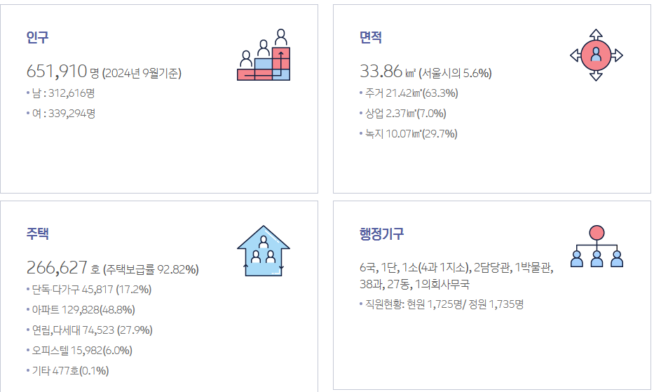 인구는 651,910(2024.9기준) 그중 남자 312,616명, 여자 339,294명이며 주택보급률은 92.82%입니다.
