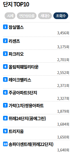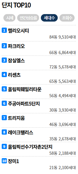 대단지에 걸맞은 편의시설과 안정적인 시세를 유지해 선호도가 높으며 송파구에는 9,510세대의 어마어마한 세대수를 보유한 헬리오시티 가 있고 6,864세대를 보유한 파크리오, 5,678세대를 보유한 잠실엘스 등 대단지 들이 많이 있습니다.
