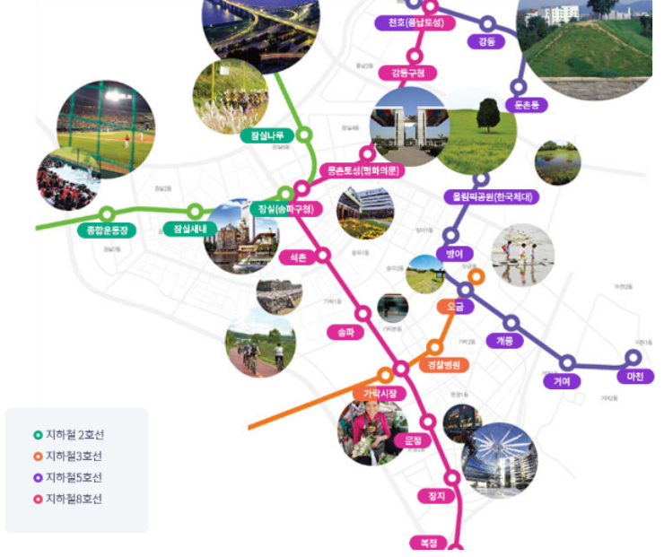 송파구를 통과하는 지하철 노선으로는 2호선, 3호선, 5호선, 8호선, 9호선 이 있습니다.