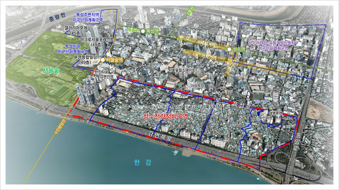 성수전략정비구역 : 성수동 일대는 서울숲과 한강을 끼고 있는 대규모 재개발 지역으로 1지구부터 4지구까지 나뉘어 개발이 진행 중입니다. 이곳은 최대 77층의 초고층 건물이 들어설 예정이며 약 9,000세대 규모의 대단지로 변모할 계획입니다.