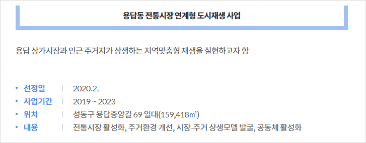 용답동 전통시장 연계형 도시재생 : 용답 상가시장과 인근 주거지가 상생하는 지역 맞춤형 재생을 실현하고자 합니다.