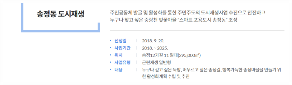 송정동 : 97-3번지 일대 모아 타운으로 추진 중이며 최대 38층 규모의 대단지 아파트로 계획되고 있습니다. 송정동 일대는 서측에 중랑천, 동측에 간선도로 등이 있어 교통 접근성이 우수하며 작은 규모로 개발하기에 적합한 특성을 갖추고 있습니다.