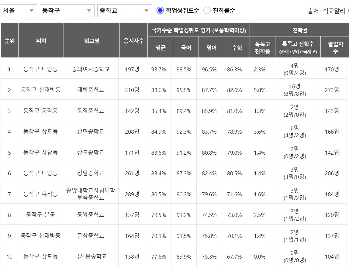 동작구 중학교 학업성취도순