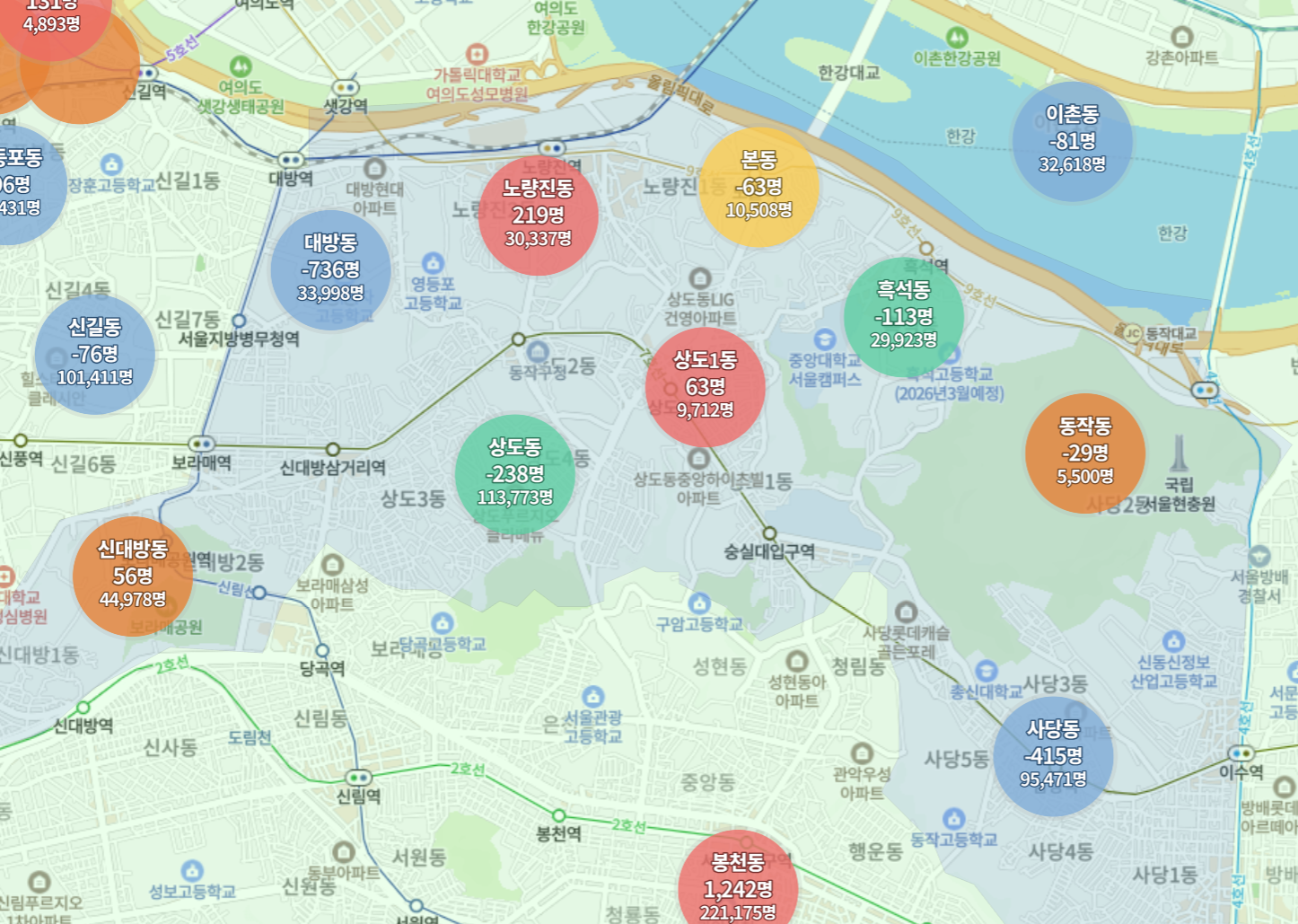동작구 인구는 동 별로 신대방동 44,978명, 대방동 33,998명, 상도동 113,773명, 노량진동 30,337명, 상도1동 9,712명, 본동 10,508명, 흑석동 29,923명, 동작동 5,550명 사당동 95,471명이며 ' 상도동 > 사당동 > 신대방동 > 대방동 > 노량진동 > 흑석동 > 본동 > 상도1동 > 동작동' 순으로 상도동과 사당동 에 가장 많이 거주하고 있는 걸로 보아 상권이나 아파트 등 거주하기 좋은 특성을 가지고 있다 예측됩니다.