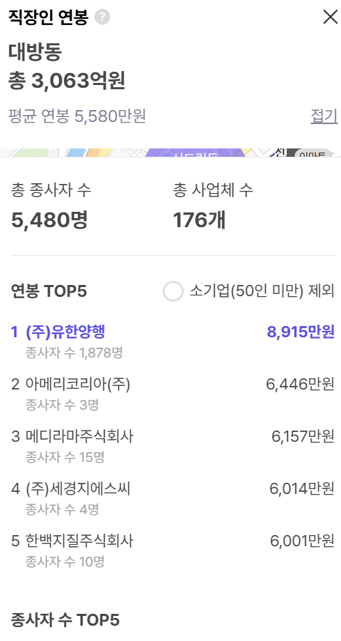 또한 동작구 동작동의 Top5 (주)비제인디자인, (주)위안소프트, (주)엘엔테크, 화성종합엔지니어링(주) 등 의 순으로 연봉이 높으며 소기업 회사 비중이 높습니다.