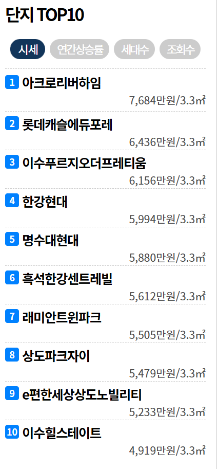 그다음 대장아파트로는 2위 롯데캐슬에듀포레, 3위 이수푸르지오더프레티움, 4위 한강현대, 5위 명수대현대, 6 흑석한강센트레빌, 7 래미안트윈파크, 8 상도파크자이, 9 e편한세상도노빌리티, 10 이수힐스테이트 순입니다.