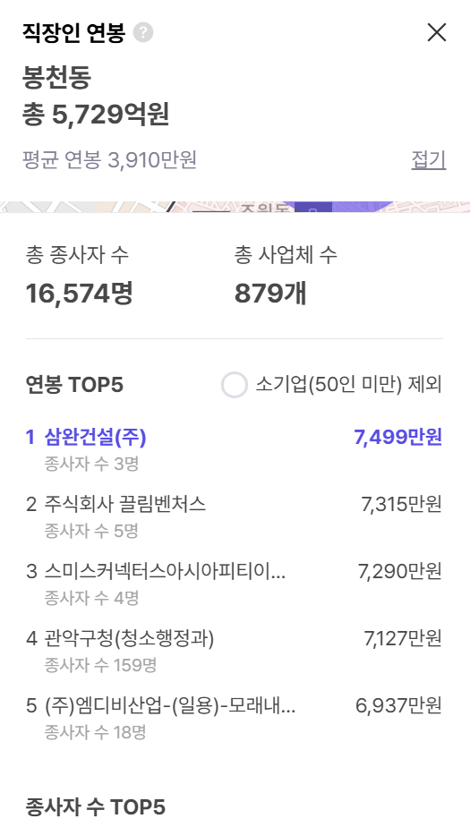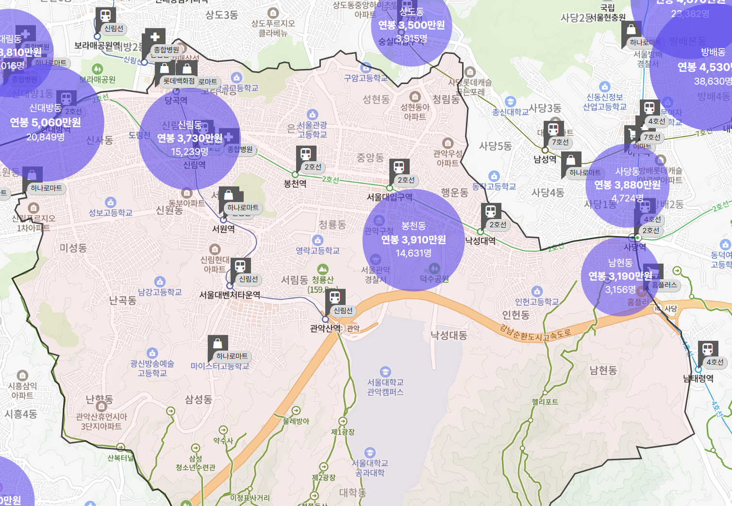 동별로는 상업·업무시설 밀집 지역과 대형 사업체가 있는 봉천동, 신림동, 남현동 에서 상대적으로 임금 수준이 높게 집계됩니다.