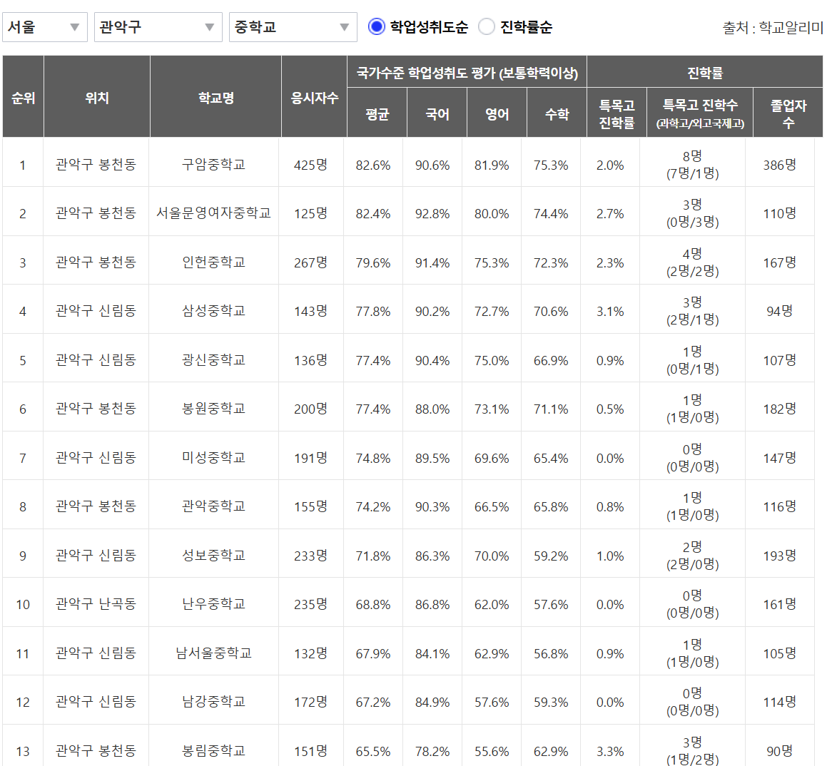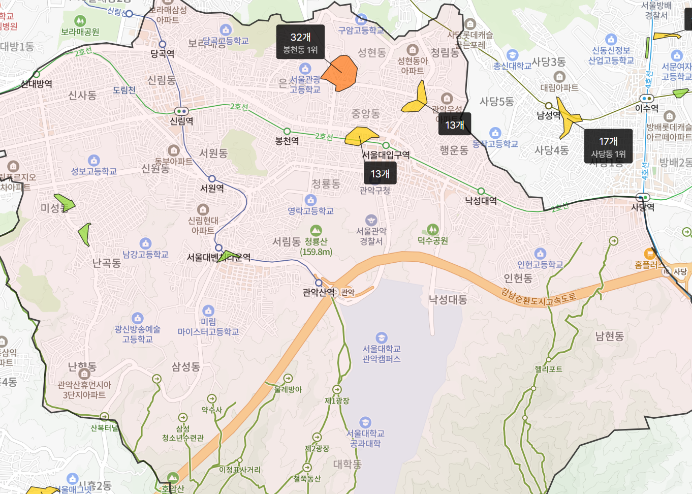 참고 지도를 보시면 서울대 인접지역 영향으로 학원가와 교육수요가 밀집한 신림·낙성대 권역이 교육열이 높은 편이며