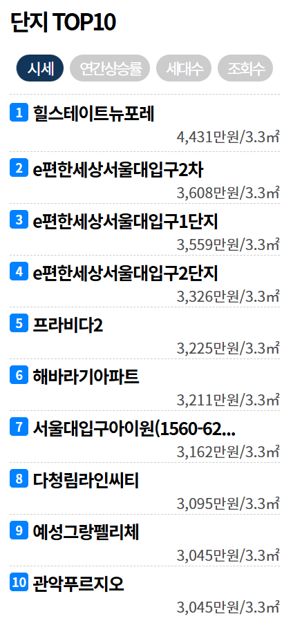 3,4위 e편한세상서울대입구1단지 와 2단지가 3,4위를 차지하고 있습니다.