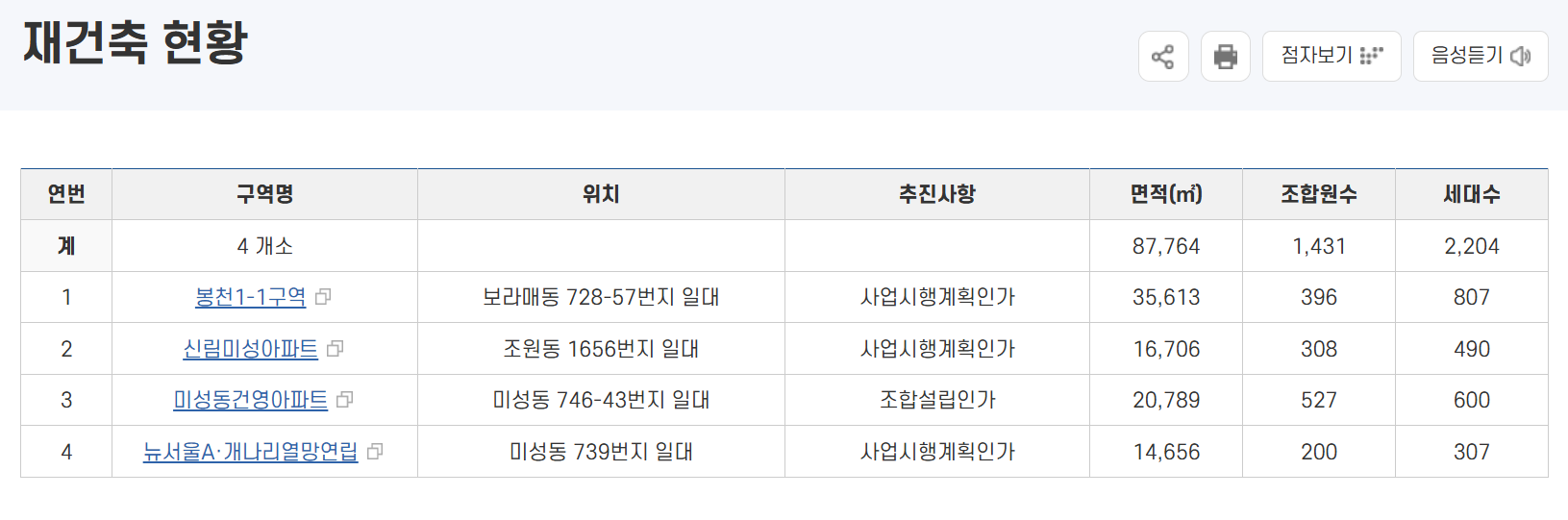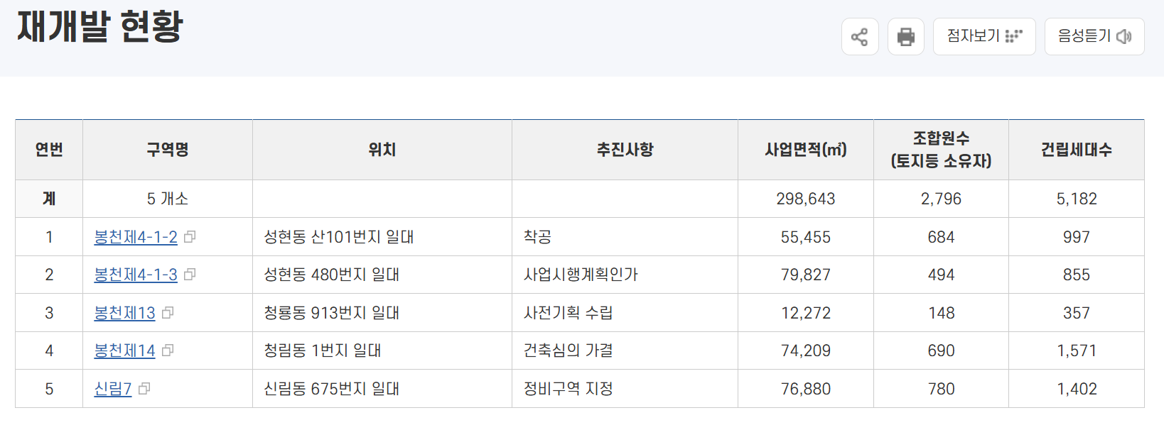 구청 자료상 봉천1-1구역, 신림미성아파트, 뉴서울A개나리열망연립 단지는 사업시행계획인가 단계에 진입해 있으며,