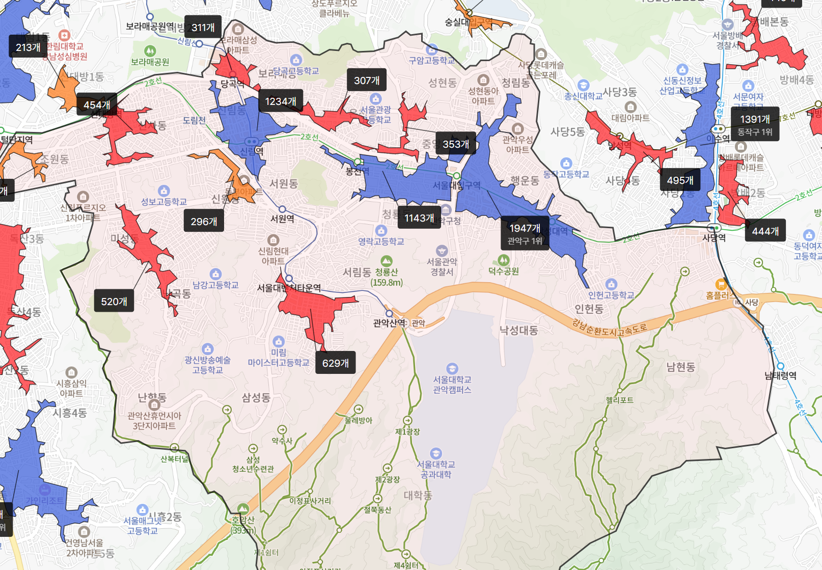 참고 지도를 보시면 서울대 인접지역 영향으로 학원가와 교육수요가 밀집한 신림·낙성대 권역이 교육열이 높은 편이며