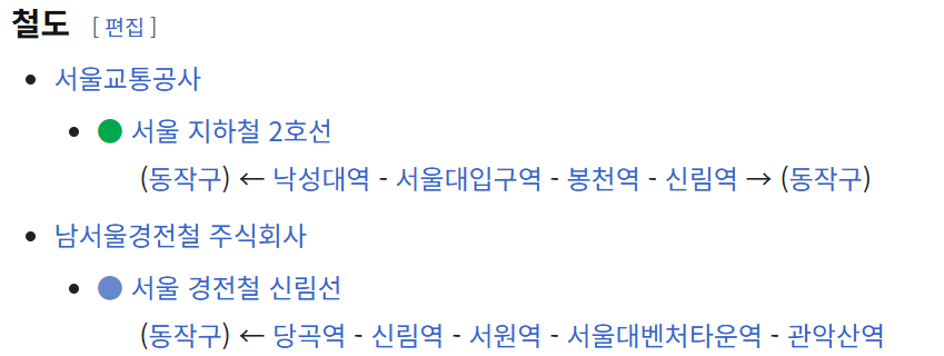 관악구의 주된 철도 축은 서울지하철 2호선(신림·봉천·서울대입구·낙성대 등)으로 구를 횡단 합니다.