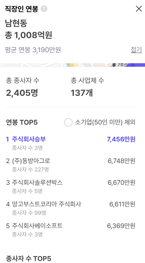 동별로는 상업·업무시설 밀집 지역과 대형 사업체가 있는 봉천동, 신림동, 남현동 에서 상대적으로 임금 수준이 높게 집계됩니다.