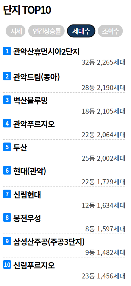 또한 관악구는 2천세대 이상 대단지가 있는 단지가 5 단지나 있으며 그중 세대수 1위로는 32동 2,265세대를 보유한 관악휴먼시아2단지가 1위, 2위로 28동 총 2,190세대를 보유한 관악드림 이 2위를 차지하고 있습니다.