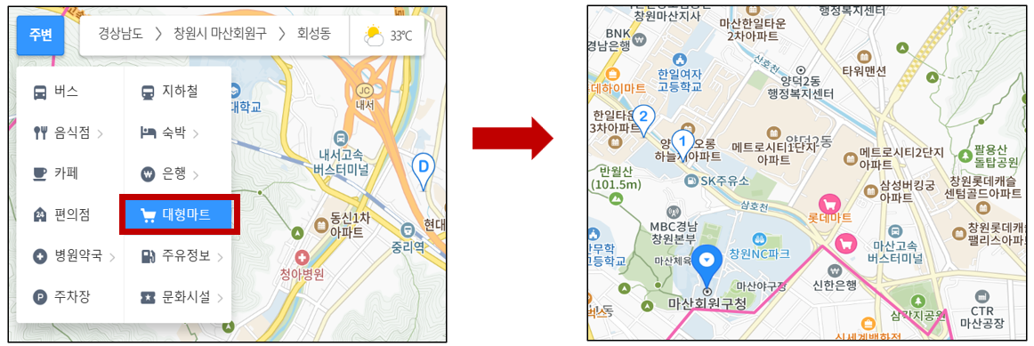 마산 회원구의 마트는 롯데마트 삼계점, 홈플러스 마산점, 롯데마트 양덕점 으로 총 3곳,