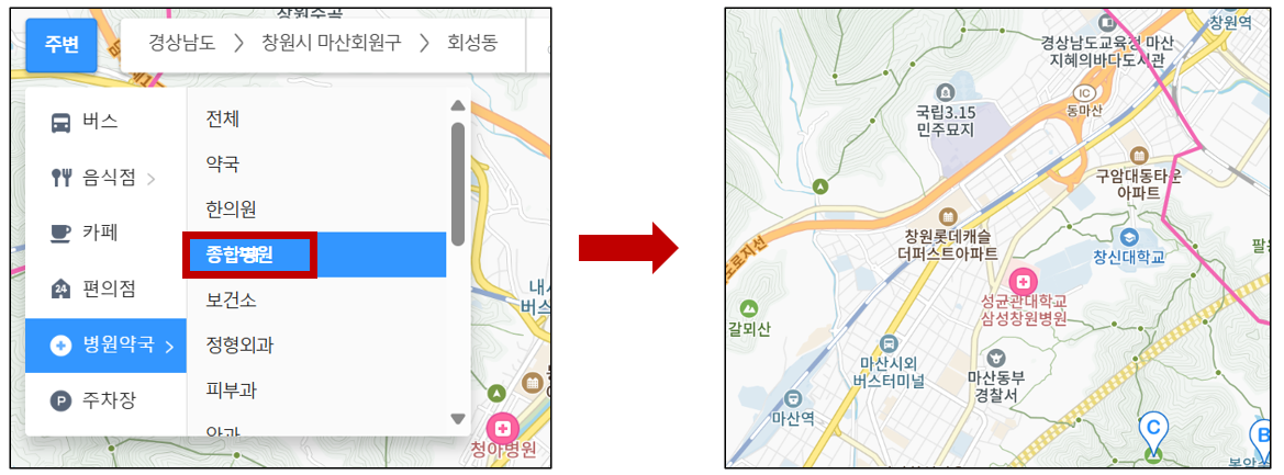 종합병원은 성균관대학교 삼성창원병원, 청아병원 총 2곳 이 있고 백화점은 마산 합포구에는 있지만 회원구에는 없습니다.