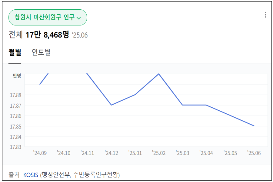 2025년 7월 기준 창원시 마산회원구의 주민등록 인구는 약 125,000명 내외이며 연령대별로는 50대 인구가 가장 많고,