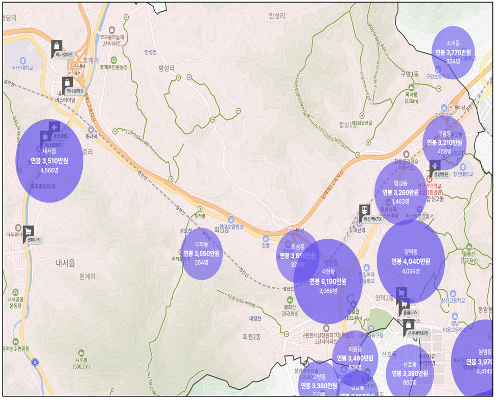 즉, 마산회원구에서는 공업·제조업 중심으로 직장이 많이 집중된 지역이 ‘봉암동’과 ‘내서읍 중리공단로’ 일대라고 볼 수 있습니다.