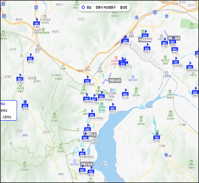 그다음 3위로 회원동에 위치한 마산무학여중 이 평균 85.2%로 3위를 차지 하였습니다.