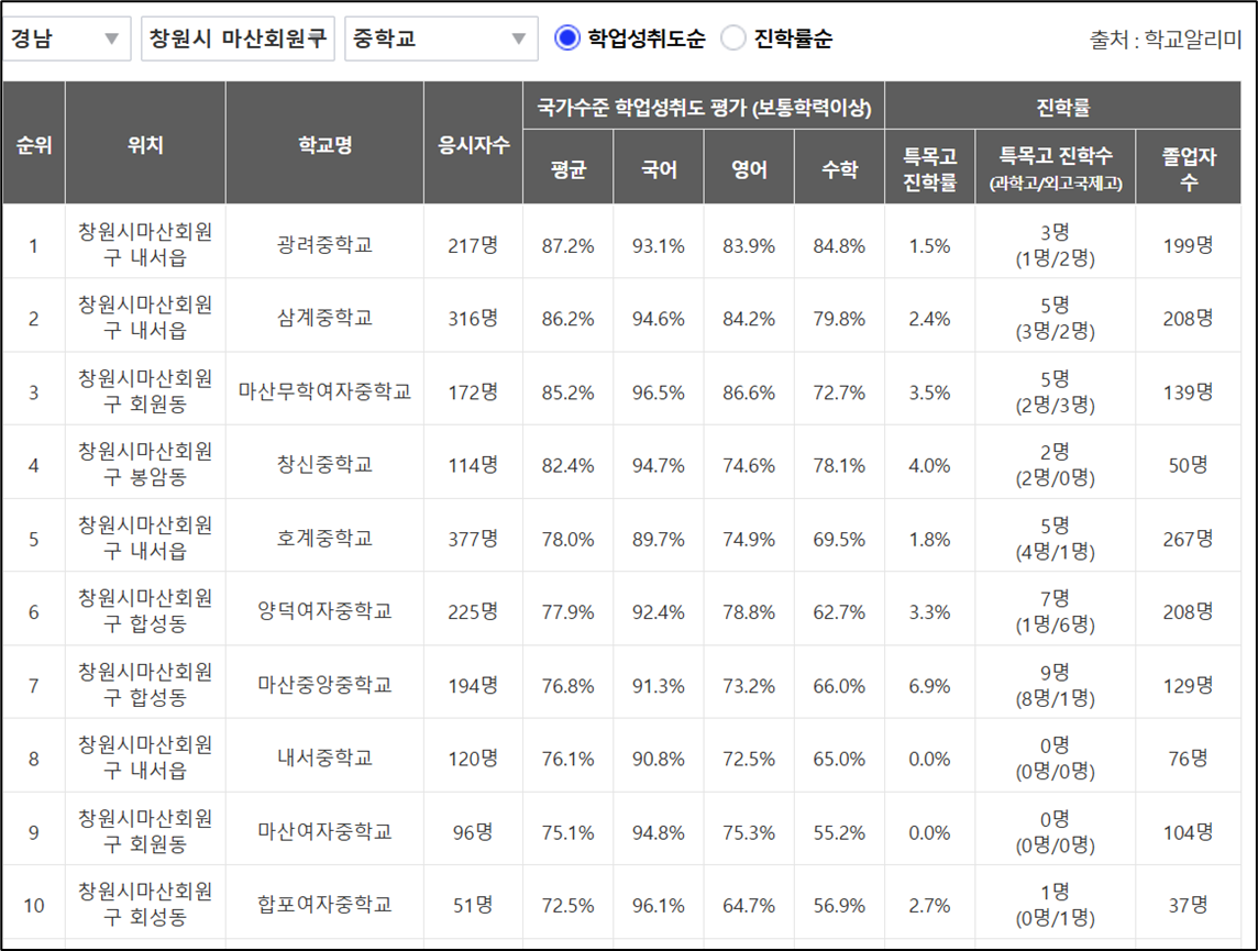 마산회원구 중학교 학업 성취도 순 1위는 평균 87.2%로 광리중, 2위는 평균 86.2%로 삼계중 입니다.