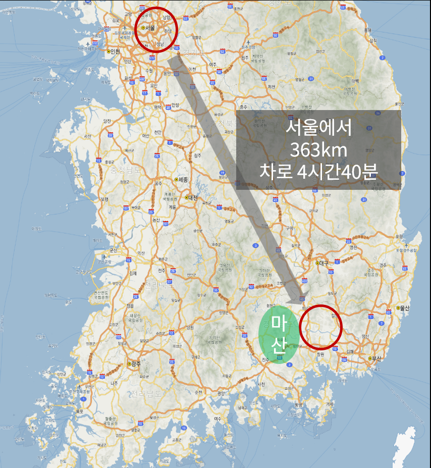창원의 북서부에 위치하고 있습니다. 서울에서 마산회원구까지의 거리는 약 320km 이며,차량으로는 고속도로를 이용할 경우 약 3시간 30분에서 4시간 정도 소요 됩니다.